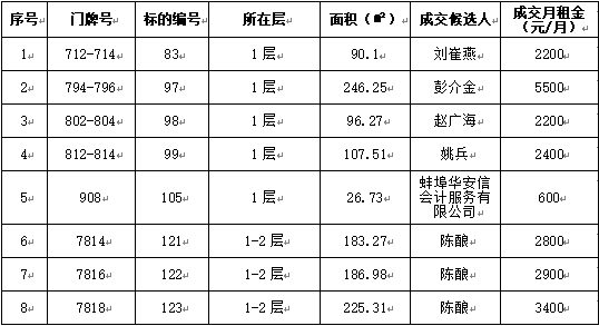 喜迎門小區(qū)部分商鋪公開競價(jià)招租工作已經(jīng)結(jié)束,成交候選人已經(jīng)確定。現(xiàn)將競租結(jié)果公示如下: