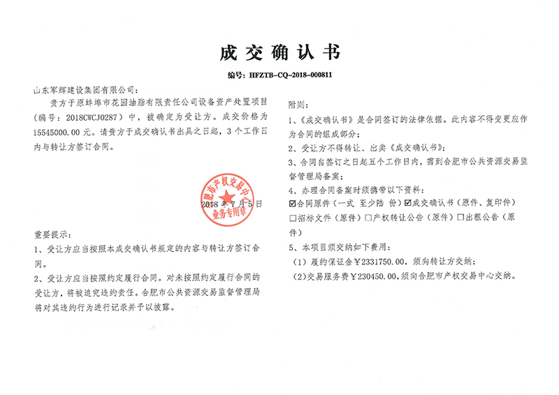 原蚌埠市花園油脂有限責任公司設備資產(chǎn)處置項目成交公告