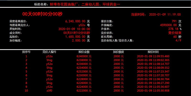 2020年1月9日在市公共資源交易平臺開展了網(wǎng)絡競價,我公司的花園油脂廠廠房及建筑物拆除權(quán)項目,公告期內(nèi)共征集到19家符合要求的競買人,最終經(jīng)過791輪的競爭出價,該項目以624萬元成交,較評估值增值459萬元,增值率達278.2%。