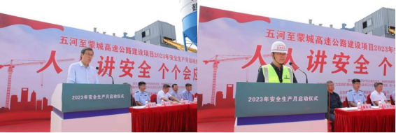 2023年6月1日,五蒙高速公司在固鎮(zhèn)縣TJ-04標拌合場站內(nèi)舉辦2023年安全生產(chǎn)月活動啟動儀式,活動主題為“人人講安全、個個會應急”。五蒙高速公司全體成員及各參建單位代表參加,市交通運輸局、市交通質(zhì)監(jiān)大隊領(lǐng)導出席活動。