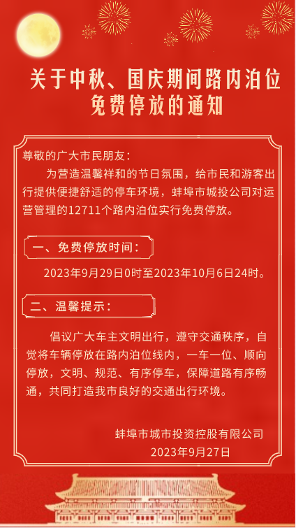 關(guān)于中秋、國(guó)慶期間路內(nèi)泊位免費(fèi)停放的通知
